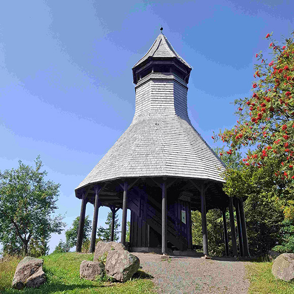 Sehr beeindruckend ist der Hochkopfturm. Dieser wurde 1925 erbaut, 1981/82 abgetragen. Die Wiederherstellung erfolgte vom Kurort Todtmoos mit Unterstützung des Landes Baden-Württemberg, des Landkreises Waldshut und des Schwarzwaldvereins. 2020 erfolgte die grundlegende Sanierung. Auf Holzstufen gingen wir zur Plattform hinauf und genossen die grossartige Aussicht auf die umliegenden Berge Belchen, Feldberg, Herzogenhorn, die Vogesen. Leider war es an diesem Tage etwas dunstig. Bei besserer Sicht kann man sogar das Alpenpanorama sehen. Wir erblickten auch die 5 Windräder bei Gersbach und in der Ferne leuchteten in hellem Weiss die Roche-Türme in Basel. Dann ging es wieder die Treppen hinab und wir wanderten weiter in Richtung eines anderen Wander-Highligths.