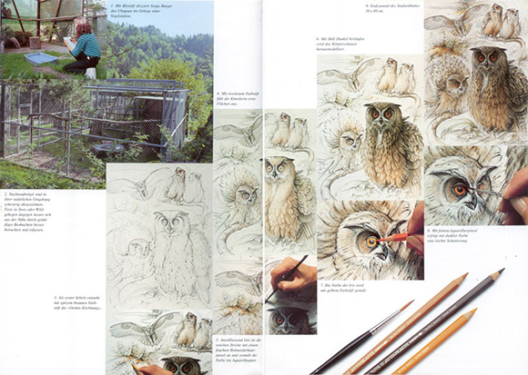 Ein paar Highlights aus meinem Schaffen: 8 Sonderbriefmarken, «Nachtaktive Tiere», mit Phosphordruck, das Licht konnte man in der Dunkelheit sehen und noch weitere vier «Tiere des Waldes». Sehr viel Weinetiketten durfte ich für Coop /Transgourmet zeichnen und gestalten. Für Franklin-Method gehöre ich seit vielen Jahren zum Team und mache alle Illustrationen für Bücher und zum Unterrichten. Für Caran d’ Ache war ich auch tätig, konnte auf einigen Messen auch im Ausland die neuen Zeichen- und Maltechniken vorstellen. Das schönste Projekt war der «Uhu» wo ich den Aufbau der Supracolor-Farbstifte darstellten konnte. Des Weiteren habe ich ca. 50 Poster für Rüdiger-Anatomie, Berlin gezeichnet. Auch für die ehemalige Swissair konnte ich eine Reihe von Gewürzpflanzen für die Menükarte (1. Klasse) darstellen und noch die allgemeine Unterhaltung an Bord mit weltweit verschiedenen Vögeln, die ja fliegen und musizieren. Einige Jahre konnte ich für «Migros» layouten. d. h. die Situationen für den Weihnachtskalender aus meiner Vorstellung zeichnen. Nachher wurden die Situationen von Fotografen aufgestellt und in Natura fotografiert. Layouten dient u. a. dem Verkauf von Projekten. Eine Zeichnung ist noch offen und lässt Änderungen zu.