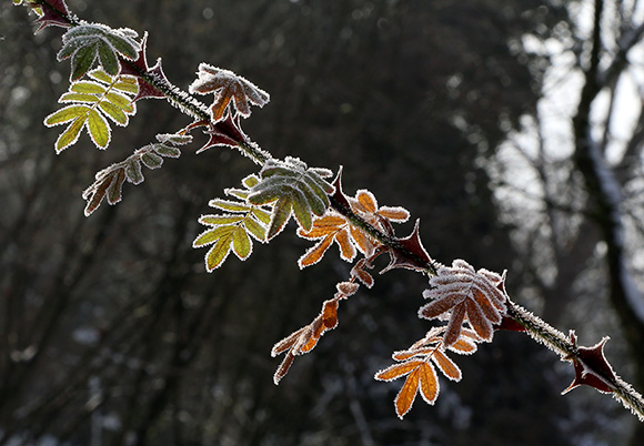 Bei frostigem Wetter in Freiburg fielen mir die bunten gefiederten Laubblätter der Stacheldrahtrose auf. Bemerkenswert sind die übergroßen roten Stacheln.