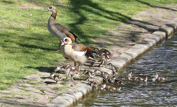 Nilgänse (Alopochen aegyptiaca ) wurden im 18. Jahrhundert als Ziervögel geschätzt und aus Afrika für Parks und Zoos nach Europa importiert. Geflohene Tiere aus Haltungen verbreiteten sich in Europa und fanden dort eine neue Heimat. Hier besiedeln sie heute viele Parks, Wiesen, Flüsse und Seen.