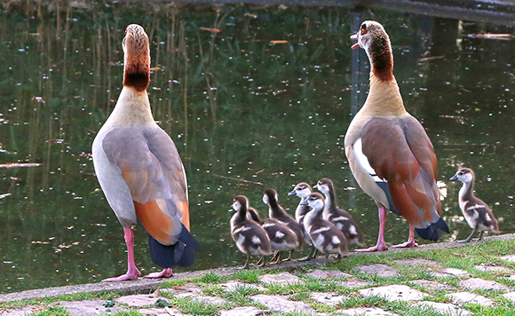 Die Nilgans kommt ursprünglich aus Afrika und hat jetzt auch in Europa ihre Heimat gefunden. Ihre Küken sehen den Küken der Stockente ähnlich, sind jedoch etwas größer und kräftiger gebaut. Beide Eltern kümmern sich um die Aufzucht. Nach etwa 10 Wochen erreichen die Küken ihre vollständige Selbstständigkeit.