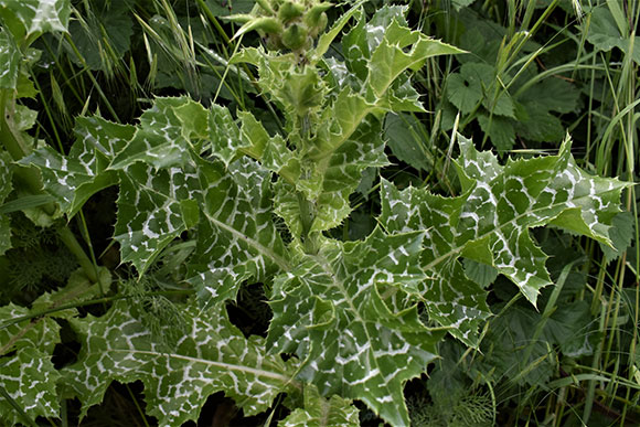 Im prächtigen Garten von Klaus Böttger, Vorsitzender der BUND-Ortsgruppe Schopfheim, wachsen einige Exemplar der Mariendistel. Zwei der Gewächse sind mannshoch. An der Spitze der jeweiligen Pflanze sind die dornigen Blütenkörbchen mit den purpur- bis lilaroten Röhrenblüten zu sehen. Auffällig sind die weiss gefleckten Blätter mit scharfen Spitzen. Nach dem Verblühen reifen braun gefleckte Samen, die einen weissen Haarschopf tragen. Der Name Mariendistel bezieht sich auf die Blätter, die der Legende nach von der Milch der Gottesmutter Maria herrühren sollen.