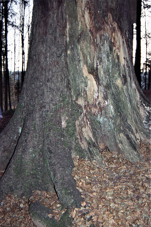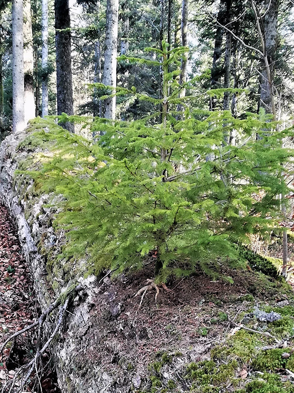 Gerd Sutter von Gersbach hat sich dankenswerter Weise bereit erklärt, den ehemaligen Gymnasiallehrer Christian Wirth und mich zu den Überresten der „Großen Tanne“ zu führen. Was wir sahen war der mächtige lange Stamm, der mit Moos bewachsen war. An mehreren Stellen wuchsen kleine Tannen und Fichten heraus. Auf der Rückseite sahen wir die von einem Baumchirurgen vor der Fällung schon angebrachte Streben zur Stabilisierung des Baumes.