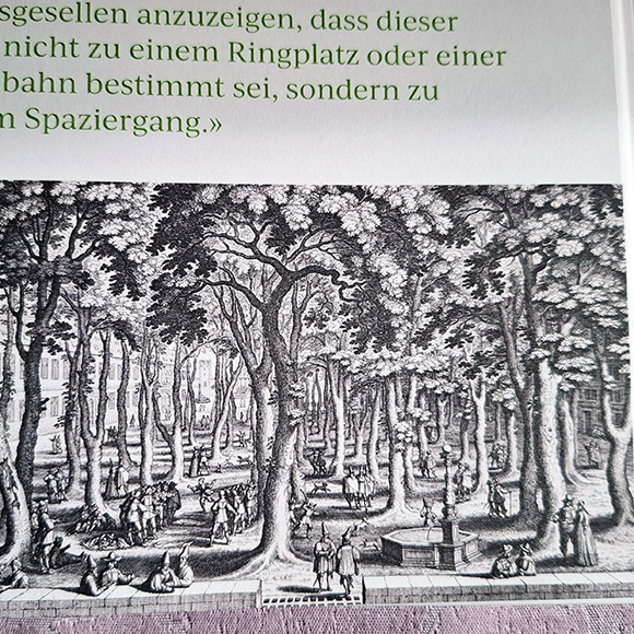 Interessant ist auch die Geschichte über den ältesten Baum seiner Art in Basel. Es ist der 270 Jahre alte Kornelkirschenbaum (Tierlibaum) im Terrassengarten am Rheinsprung. Die Autorin berichtet in bewährter Weise auch über den ältesten Park der Stadt. Es ist der Petersplatz (früher als Lusthain St. Peter bezeichnet). Es wurde berichtet, dass auf dem Platz etwa 120 Linden und Ulmen wuchsen. Das öffentliche Areal wurde früher für Sonntagsvergnügen, Ballspiele, Wettrennen (es gab Männerläufe, Frauenläufe und Dirnenläufe). Der Rat schritt 1581 ein und verbat sich diese Lustbarkeiten. Es sollte nur noch das Areal für Spaziergänge dienen.