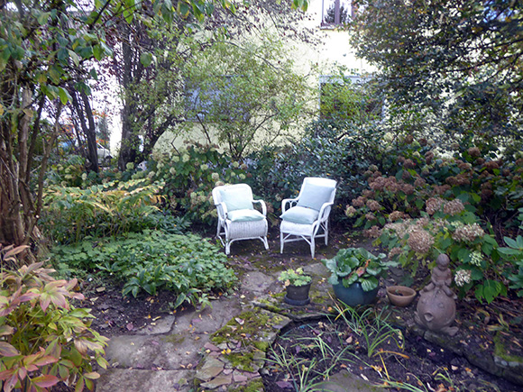 Überall gibt es Sitzplätze, manchmal auch nur einen Stuhl oder eine einzelne Bank: Vor der Küche, im „Weißen Garten“, unter der Weide, unterm Apfelbaum, zwei im „Werkstattgarten“ …, so dass man den Garten aus unterschiedlichen Blickwinkeln und Perspektiven wahrnehmen kann.